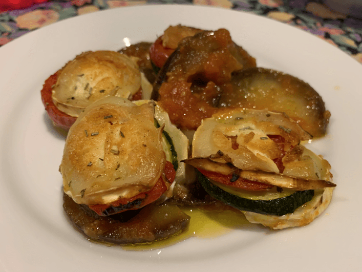 En primer lloc col·locarem en una safata rodona, un llit de tomàquet fregit fins cobrir el fons del recipient, a continuació tallarem les verdures en talls rodons i les disposarem sempre en el mateix ordre fins omplir la safata (carbassó, albergínia i tomàquets de pera) i entre mig de la verdura hi posarem formatge “feta”.