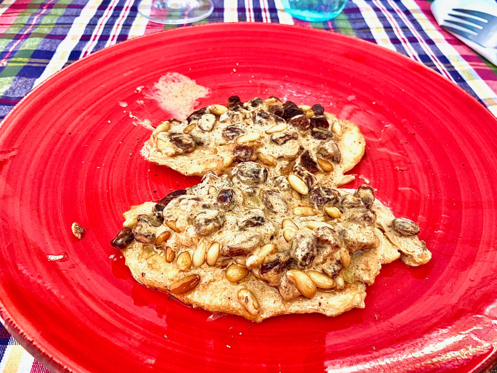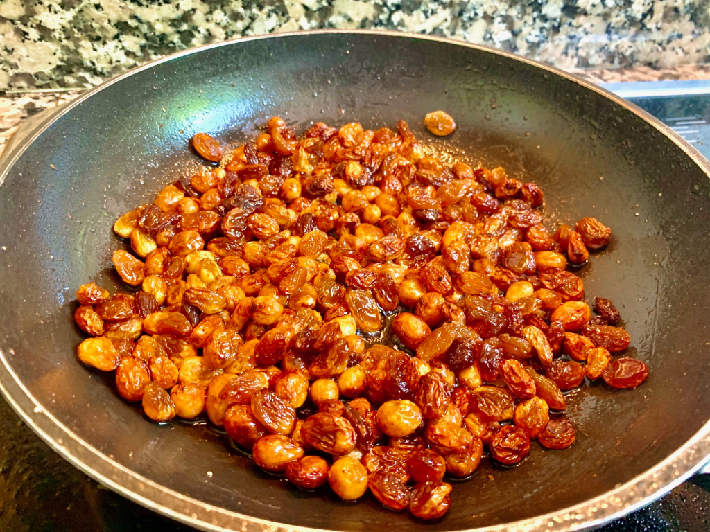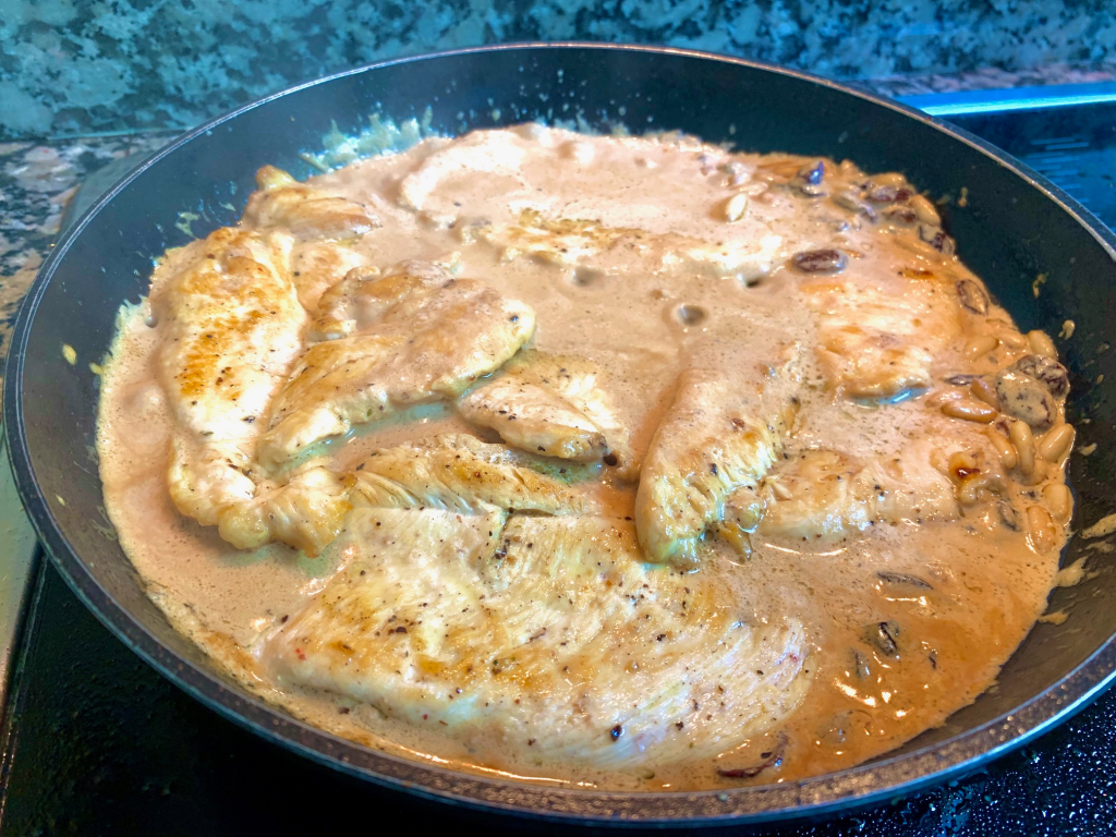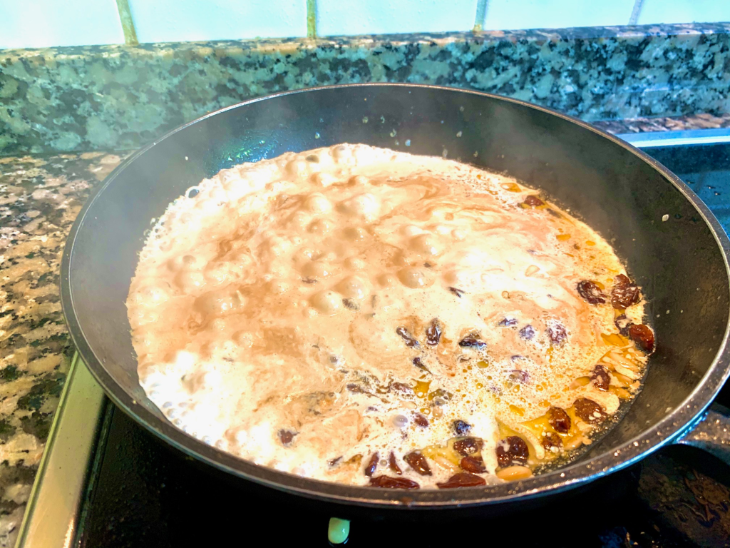 Llavors afegirem una mica d’oli al suc de la mateixa cocció del pollastre i un cop calent hi tirarem les panses de Corint a mitja temperatura, veureu mentre aneu remenant amb un estri de fusta, que les panses es van inflant i que agafen una forma arrodonida. Abans no siguin totes inflades, hi tirarem els pinyons perquè es daurin sense passar-se mentre acaben de rostir-se les panses. És llavors quan hi afegirem la crema de llet i deixarem que arrenqui el bull, moment que tornarem a posar el pit de pollastre dins la paella o recipient i deixarem que s’impregni del suc i torni a agafar temperatura.