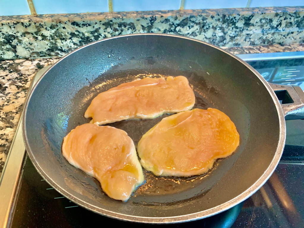 En primer lloc passarem per la planxa el pit de pollastre, que anteriorment haurem laminat en fins talls transversals i un cop cuit el retirarem del recipient.