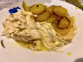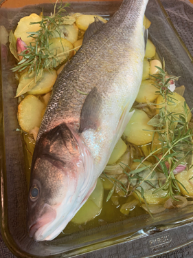 Un cop cuites les patates i la ceba, ho posarem tot de llit en el fons d’una safata de vidre apta per a forns i altes temperatures. El llobarro que haurem comprat a la peixateria d’un quilo i mig de pes (per a 4 persones) i que prèviament hem demanat que ens hi treguin les tripes i les escates, el col·locarem a sobre d’aquest llit i li posarem dins un parell d’alls sencers esclafats, una fulla de llorer, farigola, romaní o altres herbes que tinguem per casa i el salarem per dins i per fora. També posarem aquestes herbes i un parell d’alls més dins la safata i regarem el peix amb un bon raig d’oli.