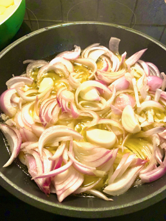 En primer lloc, sofregirem a foc lent (potxar) un parell de cebes de Figueres i unes patates forneres d’uns 5 a 8 mm de gruix en talls rodons (uns 20 minuts aprox.). Moltes vegades passa que està més bo l’acompanyament que el plat principal 😉