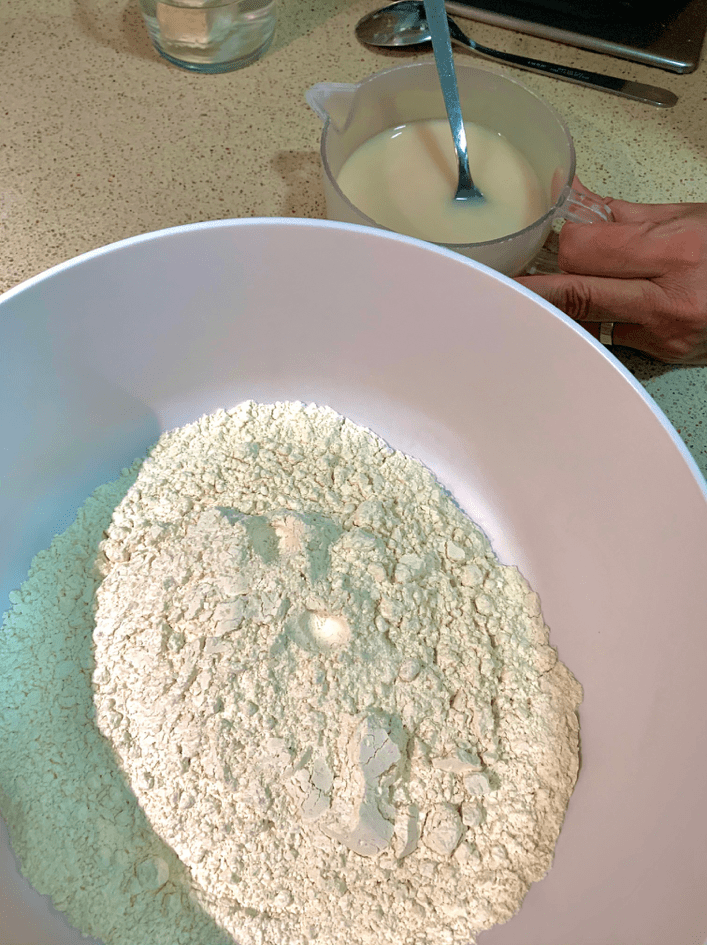 En primer lloc i dins d’un bol, barrejarem la farina i la sal, apart i en un got, farem el mateix amb el llevat fresc i l’aigua fins que quedi ben dissolt. En el bol on tenim la farina hi farem un forat al centre com si fos el crater d’un volcà i tirarem la meitat del got d’aigua amb el llevat i ho remourem, és llavors quan hi tirarem l’altre meitat del got que hem reservat abans i ho tornarem a remenar.