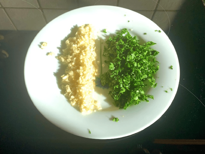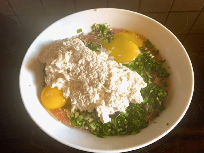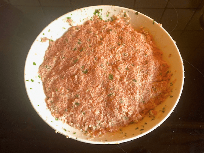 Per afegir a la massa de carn, picarem 4 dents d’all i julivert al gust de cada un, remullarem la molla de 3 llesques de pa de pagès amb llet, hi afegirem unes 4 cullerades de pa ratllat i dos ous. Agafarem tot això i ho barrejarem amb la carn que tenim per fer les “pilotilles” (amb ganes i sense por).