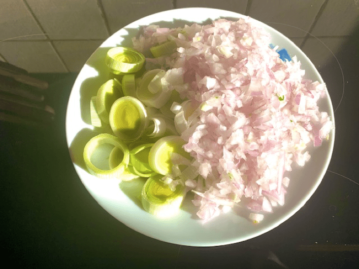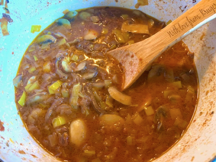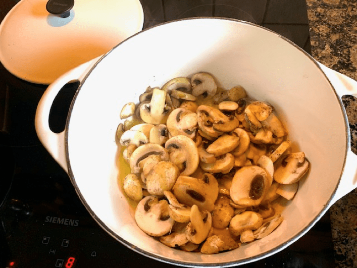 Ara ve quan prepararem l’acompanyament i en aquest cas, he fregit uns xampinyons amb oli i sal uns 3 minuts a la cassola, un cop retirats he aprofitat el mateix oli per sofregir a foc lent dos porros i una ceba dolça de Figueres durant uns 10 minuts, afegirem 4 tomàquets de pera ratllats i passats uns altres 10 minuts hi tirarem un got de vi blanc, que el deixarem reduir uns 10 minuts més, tornarem a posar els bolets dins, hi abocarem mig litre de brou (de carn, de gallina o de verdures), ho deixarem uns 20 minuts a foc lent i és llavors quan afegirem les “pilotilles” perquè agafin el gust de tot l’acompanyament durant uns 10 minuts més.
