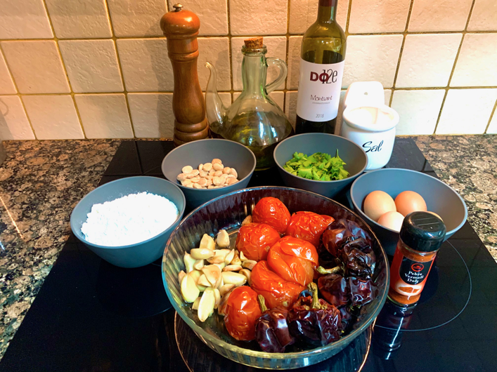 Per elaborar aquesta salsa, agafeu ½ quilo de tomàquets, dos cabeces d’alls i ho escalivem tot a la brasa (o 40 minuts al forn), la carn de 8 nyores, dues culleradetes de cafè de pebre negre, dues més de pebre vermell dolç, força julivert, ½ litre d’eoli d’oliva, 100 gr. d’ametlles pelades, mig got de vi negre i sal a discreció. Ho posem tot al “turmix”, batedora o liquadora (l’oli l’anem posant poc a poc) i és quan ja ho tenim tot barrejat, que ho hem de tastar i corregir segons les preferències de cadascú. Si ho deixeu reposar durant unes hores molt millor, agafa una textura més compacte i tots els sabors marinen de manera més uniforme.
