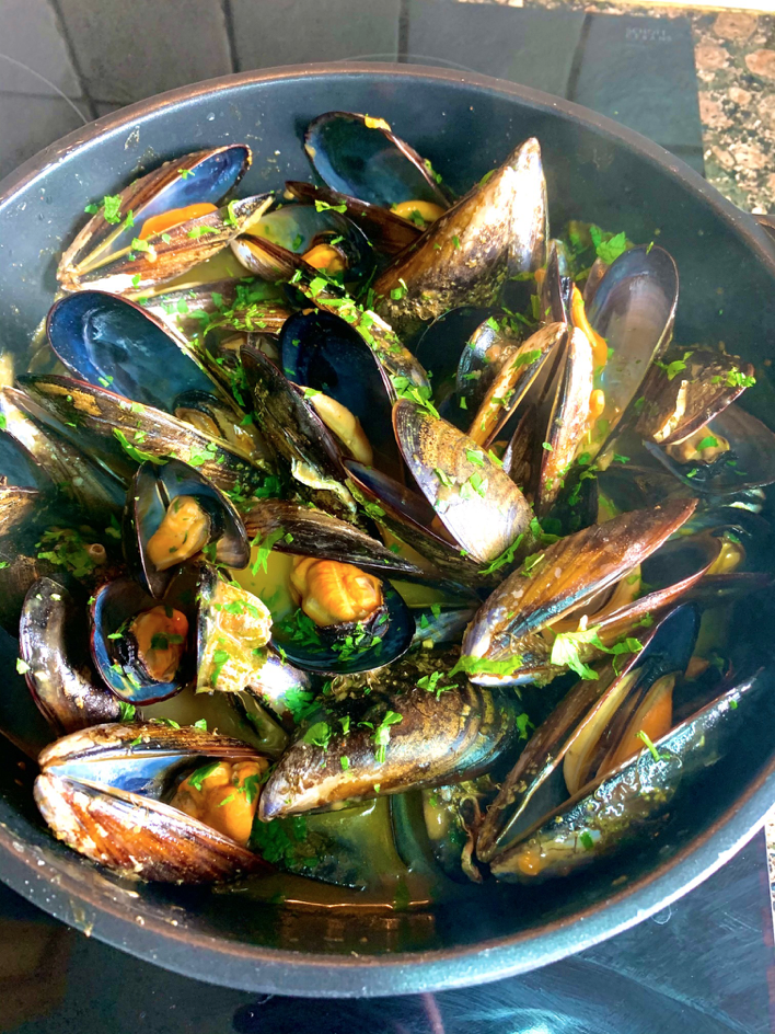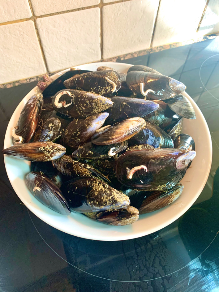 Primerament l’hi he demanat al meu peixater de confiança, uns musclos de roca de mida mitjana. Un cop a casa els he netejat, els hi he tret les barbes i qualsevol altra cosa que pugues surar al plat un cop el presentem a taula.