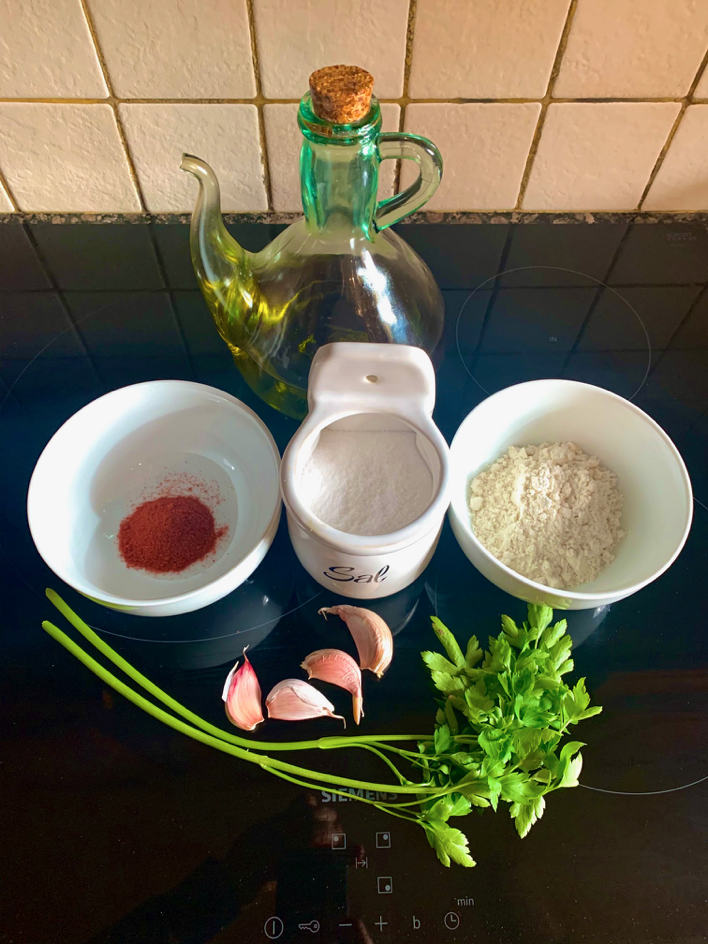 A la mateixa cassola on prepararem els musclos, sofregirem 4 dents d’all (pelats i picats), un cop daurats, que no cremats, afegirem una culleradeta de pebre vermell dolç, ho remenarem durant dos o tres segons i tot seguit incorporarem la farina, tornant ha barrejar tots els ingredients fins que formin una massa homogènia.