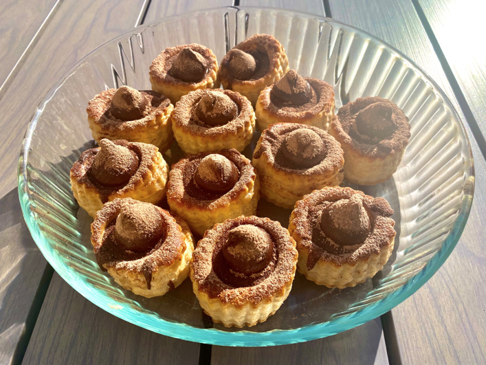 Un cop fora del forn, hi he posat unes trufes a sobre de cada pastisset i amb l’ajuda d’un colador fi, l’hi he tirat una mica de cacau en pols.