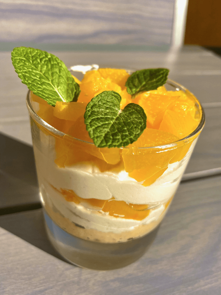 Posarem la crema dins una mànega i col·locarem el segon pis del xarrup a sobre de la galeta picada (si no teniu mànega, amb una cullera). Tallarem els 4 préssec en petits quadrats i farem el tercer pis, una altra capa de crema i una última de préssec, per decorar-ho i portar-ho a taula, unes fulles de menta sempre hi queden molt bé.