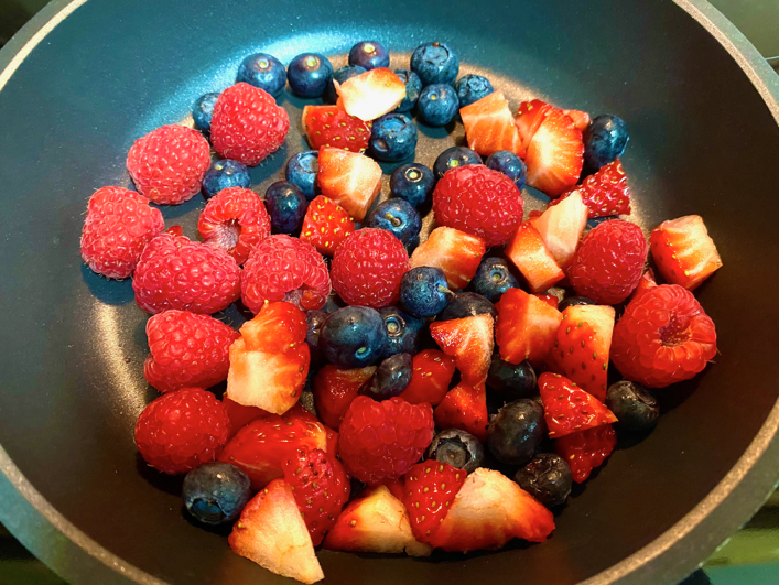 Farem servir la mateixa recepta, però canviarem el préssec per fruits del bosc; gerds, mores, nabius o maduixes (50 gr. de cada), que prèviament haurem cuit uns 10 minuts per treure el seu suc i que tirarem per sobre de l’última capa de fruits.