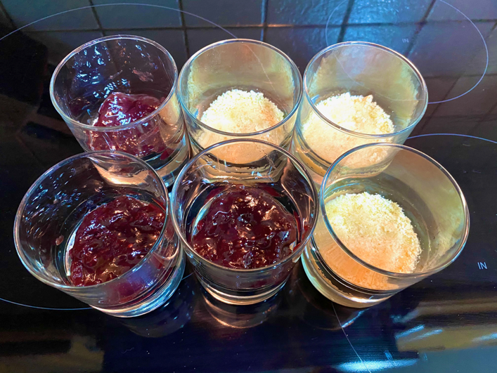Com a base del got, hi posarem unes galetes, magdalenes o melindros esmicolats, ho podeu remullar amb el mateix almívar o amb un vi dolç, en la versió que jo he fet, he posat un raig del Dotze DO Tarragona, que també utilitzarem per acompanyar a les postres.