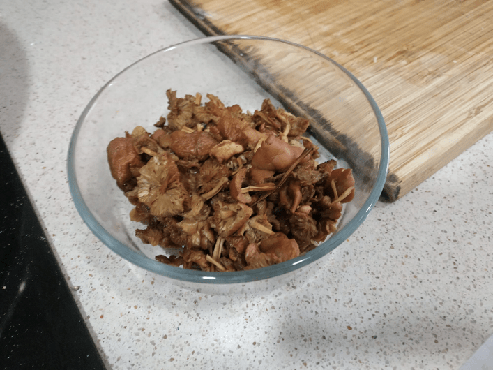 Abans de començar a cuinar a mi m’agrada tenir-ho tot a punt, és per això que agafarem uns 40 gr. de moixernons deshidratats, els remullarem en aigua i un bon raig de conyac (uns 50 ml.) i els deixem reposar uns minuts.