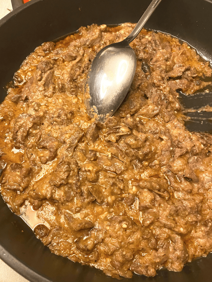 Un cop tinguem el sofregit a punt, afegirem els bolets i ho anirem remenant durant uns 6 o 7 minuts més a foc mig, moment en que posarem la vedella i aigua calenta suficient per cobrir la carn, abaixarem el foc al mínim perquè vagi fent al “xup xup”, taparem la cassola i ho deixarem així durant una hora. Un cop transcorregut aquest temps, corregirem el punt de sal si cal i uns cinc minuts abans de parar el foc, hi tirarem la picada de fruits secs i l’all que prèviament hem preparat.