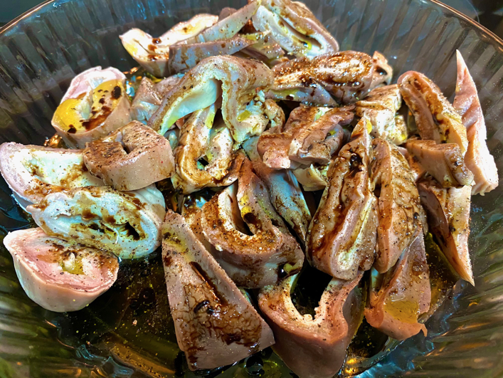 En aquest cas he comprat dos ventres de porc ja cuits per la mateixa carnisseria, un cop a casa els he tallat a trossets i els he col·locat dins un bol, on hi afegirem oli, vinagre de Mòdena, sal, pebre i qualsevol herba remeiera com la farigola, romaní o el que tingueu més a mà.