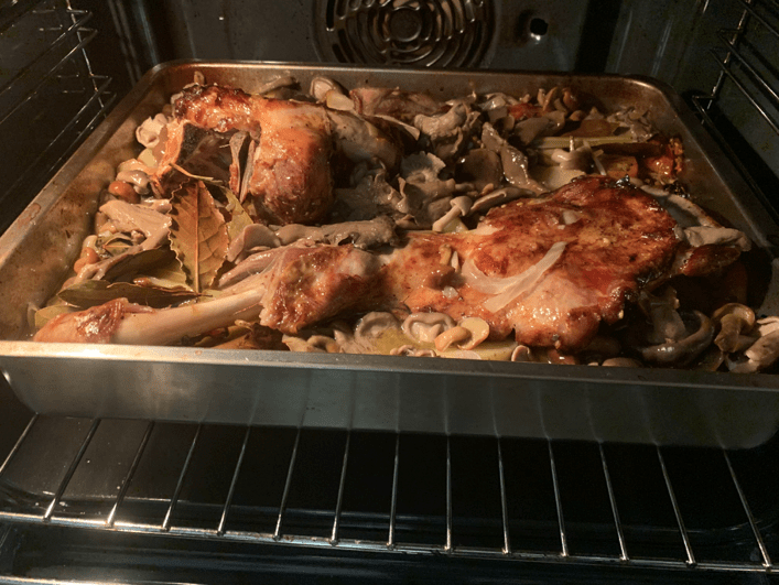 Aquest mateix pas el repetirem tantes vegades com faci falta i segons el pes de la carn, la proporció de temps per aquests casos, és d’una hora per quilo de carn, així que si les dues cuixes pesaven uns dos quilos i mig, ho cuinarem durant dues hores i mitja. Si us agrada que la peça tingui una capa de cruixent per fora, posarem només les cuixes al forn l’última mitja hora, activarem el gratinador i anirem vigilant que no se’ns cremi.