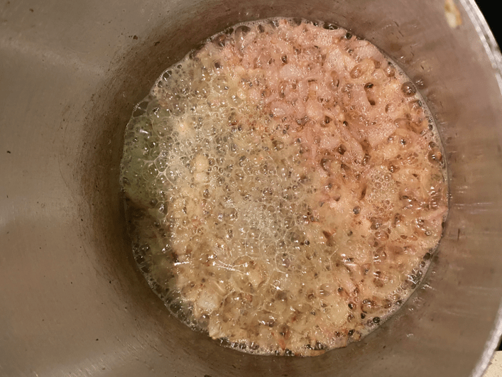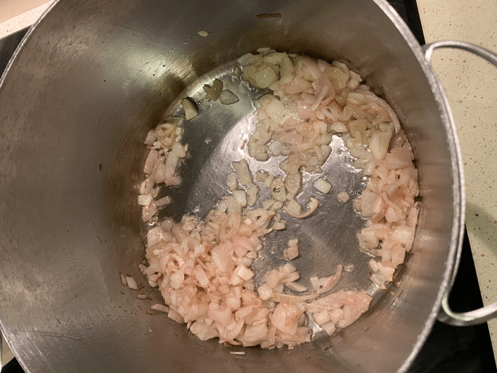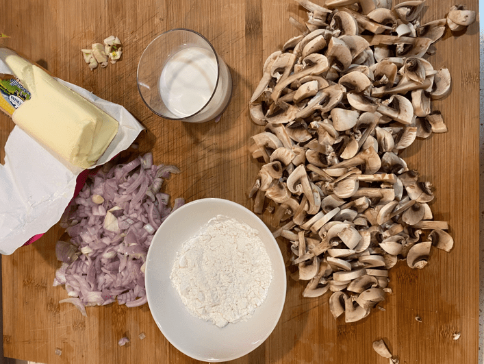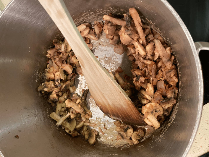 En una olla posem ceba de Figueres a sofregir, dos minuts més tard afegirem tres dents d’all picades i 50 g. de mantega, quan la tinguem ben desfeta, incorporarem dues cullerades de farina i seguidament els xampinyons que abans hem tallat a làmines i ho anirem remenant tot fins que els bolets agafin un color daurat (tots aquests últims passos van molt seguits un de l’altre i no podem badar).