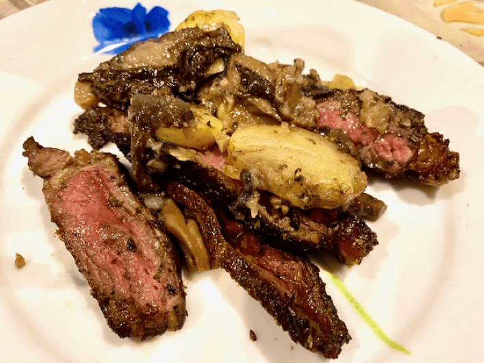 Mentre deixem reposar la carn, podem aprofitar aquest temps per preparar l’acompanyament que vulguem posar al plat i que en el meu cas el vaig fer amb bolets, prunes, carxofes i cebes confitades i escalfades a la mateixa planxa i amb els sucs de la carn que ens ha quedat anteriorment. També hi podem posar unes patates al caliu que sempre hi van bé en qualsevol plat.