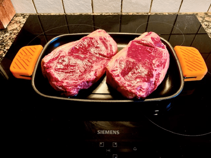 En primer lloc deixar descongelar “la bestia” durant unes quantes hores abans de cuinar-la (eren unes peces de 700 grams sense costella i de 4 centímetres de gruix). Abans que res, posarem a escalfar la planxa i hi afegirem una mica de mantega o llard si en teniu a mà, courem el “txuletó” a foc mig/alt i deixarem que es dauri durant uns 5 minuts, girar el tall i fer el mateix a l’altre cantó, important no salar la carn abans i fer-ho quan ja ha fet la crosta (de fer-ho abans perdre’m bona part de la seva substància). Un cop transcorregut aquest temps el retirarem de la planxa i el salpebrem pels dos costats, jo també hi afegeixo orenga, però ho podeu condimentar amb les herbes que més us agradin i untarem amb força oli la part externa per segellar la peça. Deixarem reposar la peça durant uns 15 minuts i només llavors filetejarem la carn al gruix que a vosaltres us agradi més, aquest repòs farà que els sucs i els sabors es quedin dins del tall i tot plegat quedi molt més gustos (aquest últim pas és molt important i l’acabo de descobrir de la mà del “webinar” del Nandu).