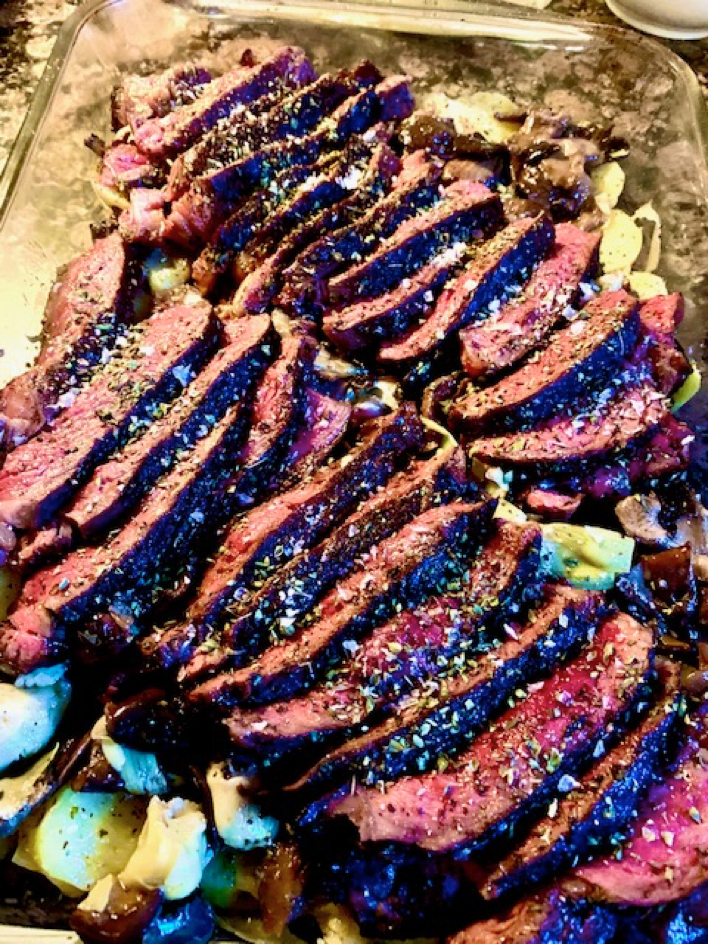 Un cop ho tenim tot preparat, ho emplatem en una safata i ho deixem 5 minuts al forn per escalfar un altre cop la carn juntament amb l’acompanyament (sense ventilador que resseca el “txuletó” i perd la seva gràcia).